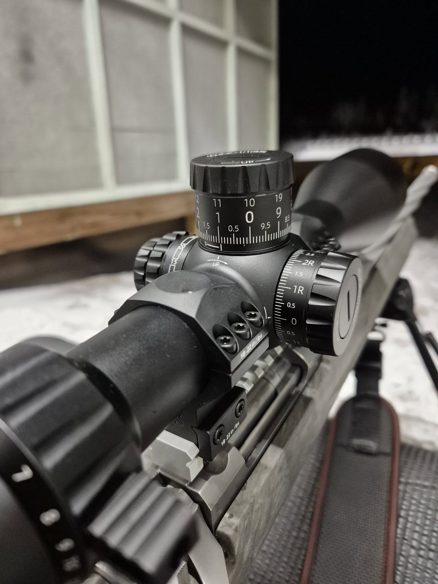 The scope is FFP (First focal plane), which is the ideal setup for long-range shooting as the reticle zooms in and out with the zoom level, meaning the markings on the reticle always mean the same. The reticle itself is clear, markings are precise, with the long-range oriented Christmas tree style reticle, where the middle cross is illuminated, aiding in low light shooting or if you’re aiming at a dark target. The adjustments are in MIL, a preferred set for the metric world.