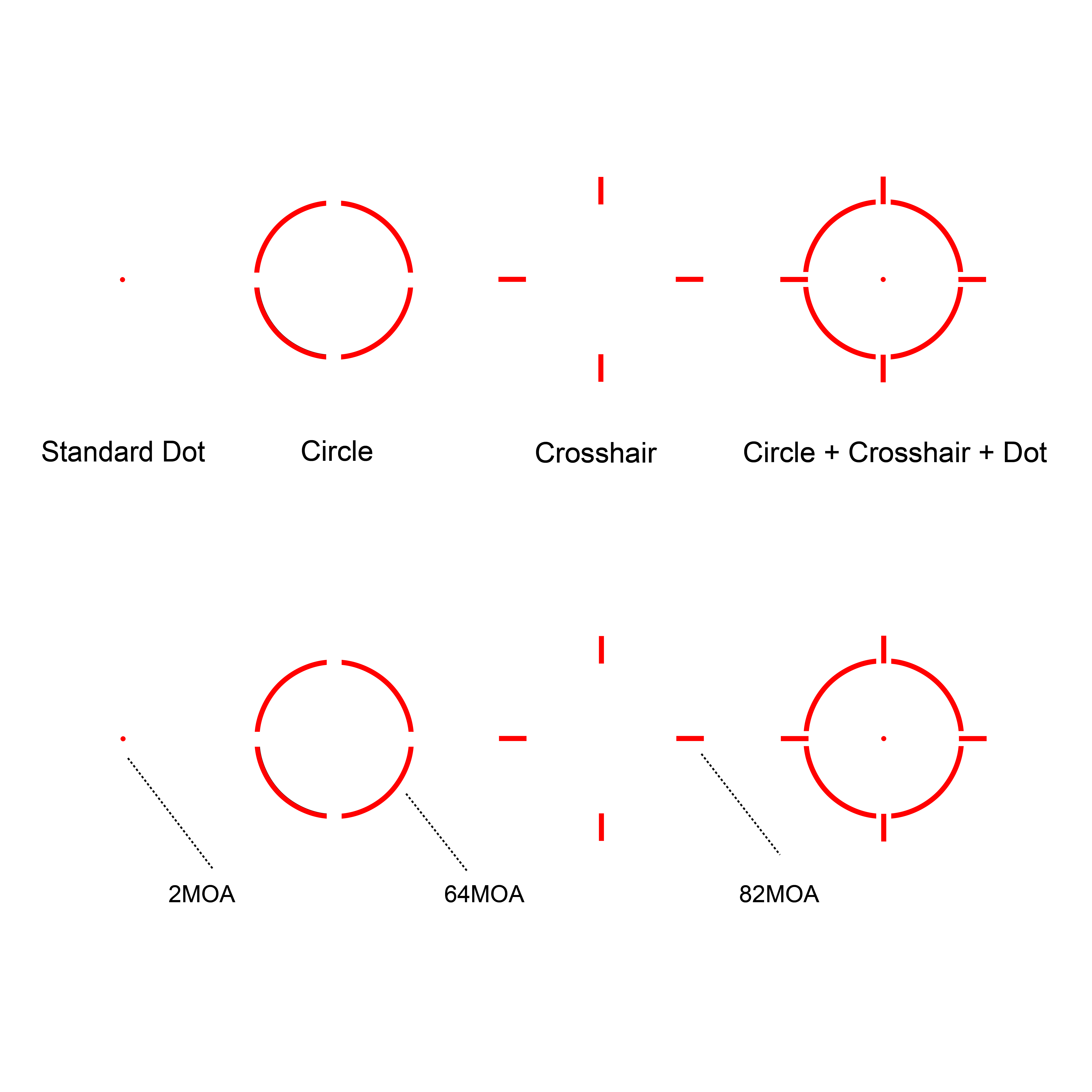 | Dot Size | Multi-Reticle (2MOA Dot, 64MOA Circle & 82MOA Crosshair) |